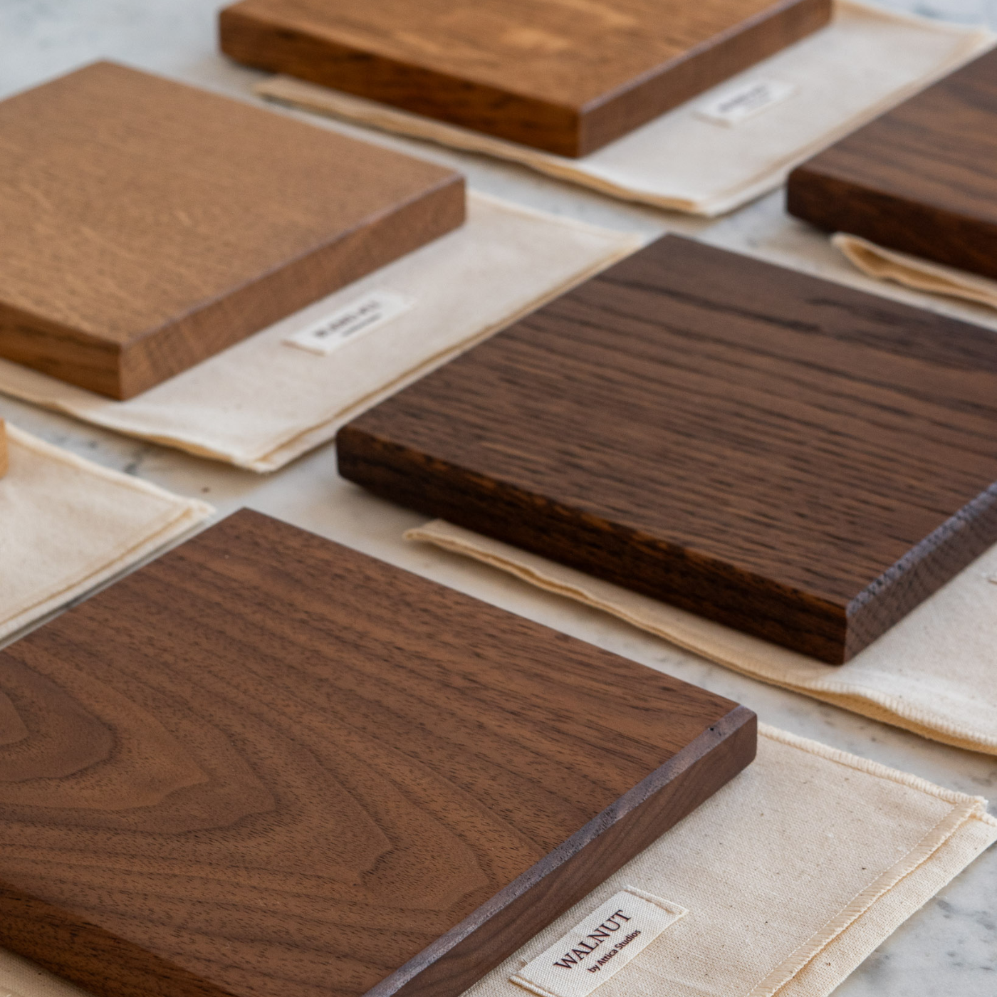 Our finishes are the final dialogue between material and maker, the stage where all the patience of the process comes to life. Each finish we use has been developed in-house through years of experimentation, refining combinations of natural pigments, oils and waxes that echo the tones found in nature until we found hues that feel balanced, timeless and true to the wood. Every piece is hand finished, layer by layer, to bring out the natural depth of the grain rather than conceal it, allowing the timber to remain the central voice of the design. We work with sustainable suppliers whose materials are made from renewable, plant based sources and carry the lowest possible emissions. In the workshop, the finishing process is meticulous: every surface is sanded, stained, sealed and waxed by hand, with each coat carefully matched so that the tone remains consistent across the piece. The result is a surface that feels alive, protected, tactile and enduring, where the beauty of the timber and the care of the craft meet in harmony.